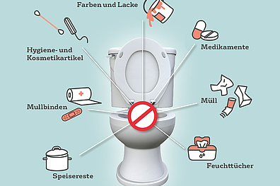 Hygieneartikel, Wattestäbchen, Windeln, Mullbinden, Haarballen, Rasierklingen, Essensreste, Medikamente – das hat alles nichts in der Toilette zu suchen. Helfen Sie also mit, die Umwelt und den eigenen Geldbeutel zu schonen. Mehr Informationen dazu finden Sie hier.